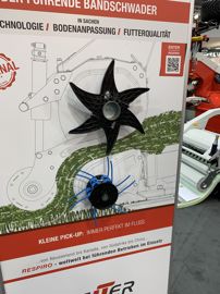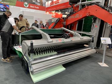 L’autrichien Reiter profitait du salon Agritechnica pour présenter l’andaineur à tapis semis-porté Respiro R8. Ce modèle compact, 30 % plus léger que son grand frère Respiro R9, affiche 4,4 t sur la bascule contre 6,6 t pour ce dernier, et s’adresse plus particulièrement aux exploitations et aux Cuma. Cet andaineur à tapis R8 ratisse sur une largeur de 8 m avec un andain central de 2 m, et travaille sur 6 m, avec ces deux éléments de 3 m chacun, en andain latéral. Il s’attèle derrière un tracteur d’une puissance de 100 ch, selon la firme.