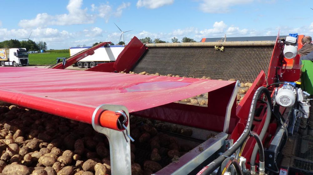 Grâce à son trieur optique mobile, la chaîne de réception présentée par Downs faisait partie des installations les plus observées sur PotatoEurope. Même si elle a déjà été dévoilée lors de précédents événements, elle continue à se montrer extrêmement innovante par ses trois sorties et la capacité de son intelligence artificielle à identifier les pommes de terre, les mottes ou les seconds choix. Toutefois, la véritable nouveauté proposée par le constructeur de Sainte-Marie-Cappel (Nord) était à découvrir sous la forme d’un tapis à tétines placé entre deux chaînes de rouleaux spires, sur le déterreur. Sa fonction est d’évacuer l’ensemble des fanes et des débris de végétaux.