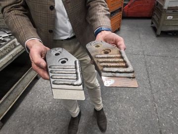 Les pièces travaillantes, au contact du sol, s’usent par le frottement des agrégats plus ou moins abrasifs comme le sable, la silice et la présence de pierres, ou bien en raison de sols secs et compacts. Pour augmenter la durée de vie de ces pièces dites « d’usures», les plaquettes au carbure de tungstène semblent être une solution intéressante. En effet, cette matière est cinq à six fois plus durable que l'acier. Elle assure un pouvoir de protection permettant de conserver la forme et les dimensions d'origine de la pièce tout au long de son usure. Les pièces travaillantes dotées de plaquettes en carbure de tungstène coûtent toutefois de trois à quatre fois plus cher que leurs homologues en acier traditionnel. Cette différence de prix s'explique d'abord par la méthode d'extraction et la rareté du tungstène. Elle est également justifiée par le processus de fixation des plaquettes sur l'acier. Nous sommes allés à la rencontre de l'entreprise lyonnaise AgriCarb, spécialisée dans la fabrication de pièces de rechange agricoles ainsi que dans l’application du carbure de tungstène sur ces dernières. Arnaud Wynands, le directeur commercial, ainsi que certains employés nous ont expliqué le processus de fixation pour obtenir une pièce en acier protégée par des plaquettes de carbure de tungstène aux endroits les plus critiques.