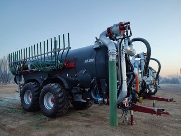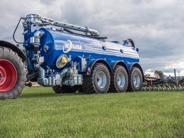 L’Allemand Kumm s’appuie sur son expérience en tant qu’entrepreneur de travaux agricoles pour développer et construire des tonnes à lisier de 16 000 à 31 000 L. Les essieux d’origine BPW profitent d’une suspension pneumatique, ou hydraulique en option. En tandem, le second essieu est suiveur ou directeur forcé par un système électro-hydraulique. En tridem, les premier et troisième essieux sont directeurs de série. Le timon à réglage hydraulique bénéficie lui aussi d’une suspension. Pour les pompes, Kumm se fournit auprès de Vogelsang, avec des modèles à lobes débitant 6 000 L/min (standard), voire 9 000 ou 12 000 L/min en option. Les tonnes reçoivent, au choix, un bras de pompage simple, à double articulation, à tourelle ou monté à l’avant du tracteur.