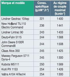 Le Lindner Geotrac 104 ep arrive en tête du classement des tracteurs de 100 à 120 ch avec seulement 221 g.kW-1.h-1 de consommation spécifique.