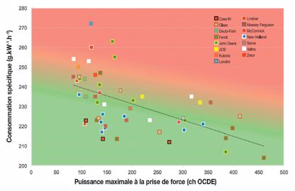 La consommation spécifique d’un moteur représente la quantité de carburant utilisée pour produire l’énergie mécanique. Nous l’avons comparée à la puissance maximale mesurée à la prise de force (OCDE) lors du passage au banc. En tendance, plus celle-ci augmente, plus la consommation spécifique diminue et plus le moteur améliore son rendement énergétique. Ainsi, c’est le tracteur le plus puissant jamais essayé et passé au banc, le Fendt 1046 Vario, de 460 ch de puissance maximale mesurée à la prise de force (OCDE), qui se classe en tête des moteurs les moins gourmands en carburant (204 g.kW-1.h-1). L’écart avec le tracteur le moins bien classé s’élève à 68 g.kW-1.h-1. De fait, alors que le Fendt 1046 Vario présente un rendement de 43 %, le tracteur affichant le moins bon rendement énergétique de tous nos tests depuis cinq ans atteint 32 % et délivre une puissance maximale de 118,3 ch.