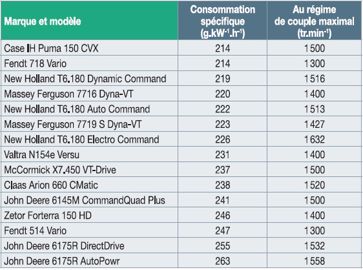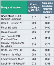 Dans la tranche de puissance très disputée des 150 à 200 ch, le Case IH Puma 150 CVX et le Fendt 718 Vario, ex æquo, se partagent la première place du classement. Ils affichent en effet la même consommation spécifique, soit 214 g.kW-1.h-1, respectivement au régime de couple maximal de 1 500 et 1 300 tr.min-1. Leur moteur, le FPT de 6,7 L sur le Case IH et le Deutz AG de 6,06 L sur le Fendt, présente alors un rendement de 41 %. Le New Holland T6.180 Dynamic Command possède le même moteur que le Case IH en tête de ce classement. Lors de nos essais, il a pris part à un comparatif entre trois tracteurs se différenciant uniquement par leur transmission, avec le T6.180 Auto Command, cinquième de notre classement, et le T6.180 Electro Command, septième. Un autre comparatif a confronté deux John Deere 6175R, l’un doté de la transmission DirectDrive, l’autre de la variation continue AutoPowr. Ces deux tracteurs ferment la marche de ce classement.
