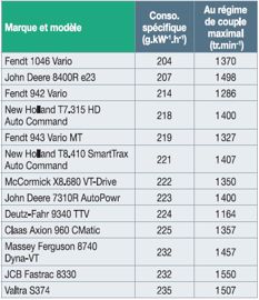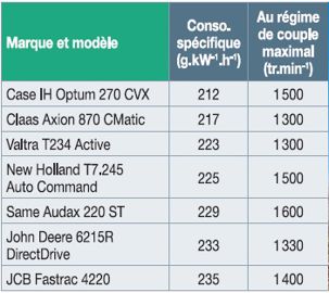 Avec une consommation spécifique de 212 g.kW-1.h-1 au régime de couple maximal de 1 500 tr.min-1, le tracteur Case IH Optum 270 CVX vire en tête dans la tranche de puissance de 200 à 300 ch, selon les données de nos tests. Son moteur à six cylindres FPT, de 6,7 L, affiche en effet le très bon rendement de 41 %. Le Claas Axion 870 CMatic, doté d’un bloc FPT, avec 217 g.kW-1.h-1, et le Valtra T234 Active, équipé d’un moteur maison Agco Power, avec 223 g.kW-1.h-1, complètent le podium. En queue de peloton, le John Deere 6215R DirectDrive, doté d’un moteur maison, et le JCB Fastrac 4220, pourvu d’un bloc Agco Power, affichent tous les deux une consommation spécifique supérieure à 230 g.kW-1.h-1.
