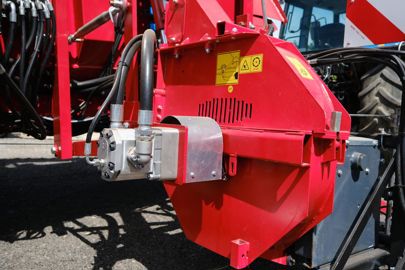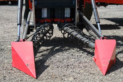 La récolteuse Ferotin, pour sa part, peut se placer à côté du caisson, en parallèle. Pour plus de maniabilité en entrée et sortie de rang, elle se dote d’un essieu directionnel disposant de trois modes de fonctionnement : bloqué, manuel avec le joystick en cabine ou automatique pendant la récolte. La tête de récolte reçoit des palpeurs de rang (moustache et capteurs angulaires) pour diriger cet automatisme. « Le chauffeur peut alors se concentrer sur la direction du tracteur et le bon fonctionnement de la récolteuse », se félicite Claude Ferotin.