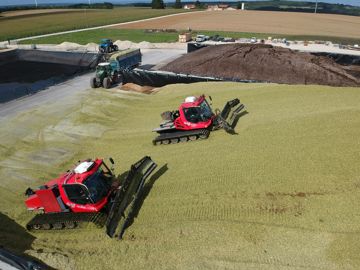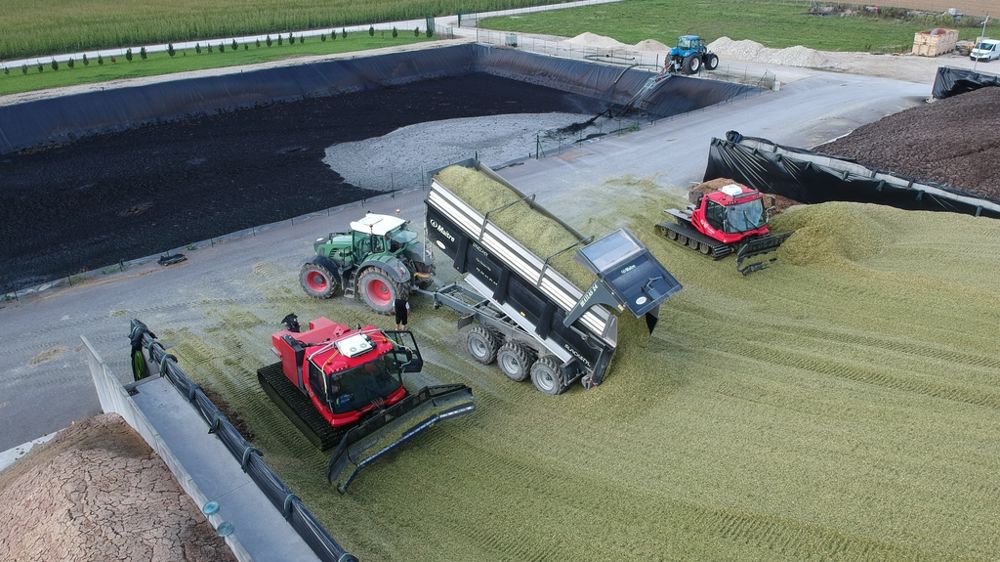 Le jour de notre reportage, les deux dameuses évoluaient ensemble sur un silo de 30 m de largeur dépendant d’une méthanisation. L’ensileuse récoltait du maïs implanté en interculture, ainsi que des champs de silphie, une plante fourragère qui intéresse les producteurs de biogaz. En effet, les parcelles sont souvent implantées pour 10 ou 15 ans, car cette culture pérenne repousse après chaque coupe. L’ETA fournissait aussi trois remorques à triple essieu pour réaliser les allers-retours jusqu’au champ.