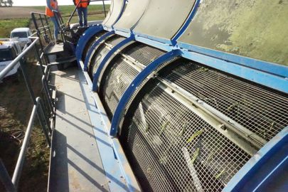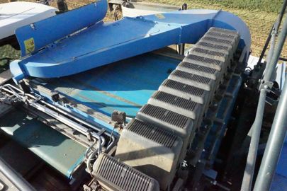 Par la force centrifuge, le stripper décolle la matière et la projette sur le batteur qui tourne en sens inverse. Les gousses sont alors éclatées et projetées sur des grilles de différents diamètres, interchangeables, par lesquelles sont évacués les pois et la végétation. La présence de seulement quatre rangées de grilles, contre six sur d’autres machines augmente la surface de criblage ainsi que le débit de chantier, d’après Steco-Ma. Les produits se dirigent ensuite vers un tapis incliné qui dispose de trois vibreurs, dont un est installé à leur chute pour assurer l’efficacité de séparation des pois et des déchets. Ces derniers sont ainsi évacués. Les pois passent ensuite sur un tapis central et remontent vers la trémie via une chaîne à godets. Ce tapis central peut être démonté au champ. En effet, son châssis est divisé en plusieurs parties assemblées par de simples écrous accessibles sur le côté ou à l’avant de la machine. Cela facilite l’intervention en cas de bourrage ou de casse.