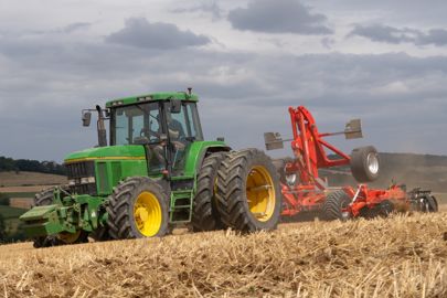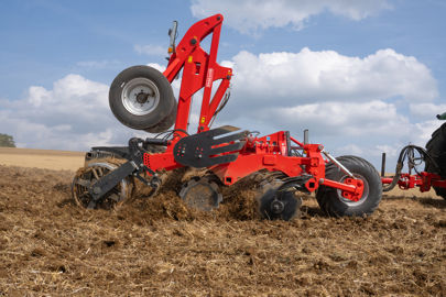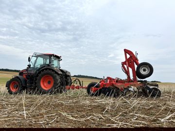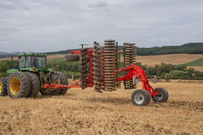 Outre le travail du sol, l’essai a été l’occasion de tester la manœuvrabilité du déchaumeur. Attelé aux bras de relevage et doté d’une tête d’attelage articulée, le Quivogne Diskator tourne court. Replié hydrauliquement pour le transport, il se faufile aisément dans les rues étroites des villages. L'outil reste cependant plutôt long en format routier, le bras supportant l’essieu se repliant en deux. Il convient ainsi de ne pas prendre des virages trop courts afin qu’il ne morde pas sur les bas-côtés. Sur la route, même à 40 km/h, le déchaumeur reste stable et n’engendre pas de ballant sur le tracteur. Notons que le Diskator s’équipe ici de pneumatiques d’une dimension 445/45 R19,5. Afin de prendre les virages en toute sécurité, j’abaisse le relevage du tracteur ainsi que le déchaumeur de sorte à transporter l’ensemble relativement près du sol et à garder ainsi un centre de gravité bas pour une bonne stabilité dans les courbes. Je laisse juste le dégagement nécessaire afin de passer les dos-d’âne de Haute-Saône. Au champ, la tête d’attelage articulée me permet de tourner très court. J’arrive à faire mes passages les uns à côté des autres sans avoir à reculer. Je n’ai qu’à lever l’outil, tourner et me repositionner contre le passage précédent. La largeur des fourrières reste pour autant contenue. Trois tours de parcelle, et ce chantier est terminé.