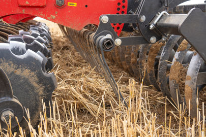 Afin d’apprécier le comportement du déchaumeur dans diverses conditions, j’organise un chantier en partenariat avec la ferme voisine. Il s’agit alors de réaliser un premier passage derrière un colza dans une parcelle de 19 ha au sol argilo-calcaire et caillouteux. Le salarié de l’exploitation entame les premiers mètres. À une profondeur de travail de 10 cm, le John Deere 7710 de cette exploitation parvient à maintenir une vitesse de travail de 12 km/h sur le plat. Dans les côtes les plus raides, le tracteur plafonne cependant à 8 km/h. Afin d’assurer un meilleur flux de matière, nous remontons manuellement la herse peigne. Nous nous apercevons, au fil des hectares, qu’une vitesse de travail limitée permet d’éviter les bourrages. En plus des cannes de colza à évacuer, une zone du champ est jonchée de cailloux. Je me dis que ces quelques hectares seront ainsi l’occasion de tester en sol caillouteux les aptitudes de l’outil embarquant un seul disque par bras. Notons par ailleurs que la sécurité non-stop de chaque bras est assurée par quatre boudins élastomères. À 12 km/h, le déchaumeur pianote facilement sur les nombreuses pierres. Je note également que, grâce à la présence d’un seul disque par bras, les plus gros cailloux ne restent pas coincés. Les décrotteurs empêchent, pour leur part, le blocage des pierres dans le rouleau ajouré.