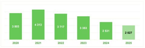 Evolution des premières immatriculations de tracteurs vignes et vergers (2020-2025)