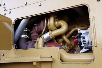 Le Weiler S250 dissimule sous ses robustes capots des éléments dont la réputation n’est plus à bâtir. En effet, il embarque un moteur Caterpillar C7.1, un six-cylindres de 7 L développant 200 ch à l’aide de deux turbocompresseurs. Le bloc, en porte-à-faux avant, se conforme à la norme antipollution Stage V, avec un dispositif SCR puisant l’AdBlue dans un réservoir de 19 L placé juste derrière la calandre. Les 315 L de GNR se stockent pour leur part dans la section arrière du châssis articulé. La transmission, elle aussi d’origine Caterpillar, compte cinq rapports powershift à passage sous charge et un doubleur automatique, portant le nombre total de rapports à dix. La boîte de vitesses partage la même huile que le système hydraulique, stockée dans un réservoir sous la cabine. Cette dernière bascule si besoin sur le côté droit pour accéder aux différents organes présents sous son plancher. Un vérin hydraulique optionnel, alimenté par une pompe manuelle, facilite cette opération. Tous les autres accès pour l’entretien se dissimulent derrière des trappes disposées de part et d’autre du capot métallique couvrant le compartiment moteur.