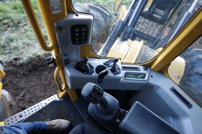 Le S250 profite d’une cabine plutôt spacieuse pour sa catégorie, un opérateur et un démonstrateur tenant sans problème à l’intérieur. Son tableau de bord se résume à un écran jouxté de boutons permettant d’ajuster les différents paramètres de la machine. Celui-ci affiche aussi le compte-tour, les différentes jauges et le rapport de transmission engagé. La console latérale reçoit deux commandes mécaniques actionnant le treuil et la lame frontale. Toutes les autres fonctions se pilotent depuis les deux joysticks, installés sur chacun des accoudoirs du siège pivotant. Celui de gauche dirige le véhicule et comporte à son sommet un basculeur (F-N-R), pour l’inversion du sens de marche, et deux boutons pour le passage des rapports sous charge. Le joystick de droite commande l’élévation et l’inclinaison de la double arche. Il compte quatre boutons pour la rotation et l’ouverture/fermeture du grappin. Deux paires de pédales, correspondant aux freins et à l’accélérateur, autorisent la conduite de l’engin, quelle que soit la position du siège : face à l’avant ou dans une position trois quarts arrière. Le retournement du poste de pilotage permute la commande d’inverseur, et le bip de recul retentit alors lorsque le skidder avance.