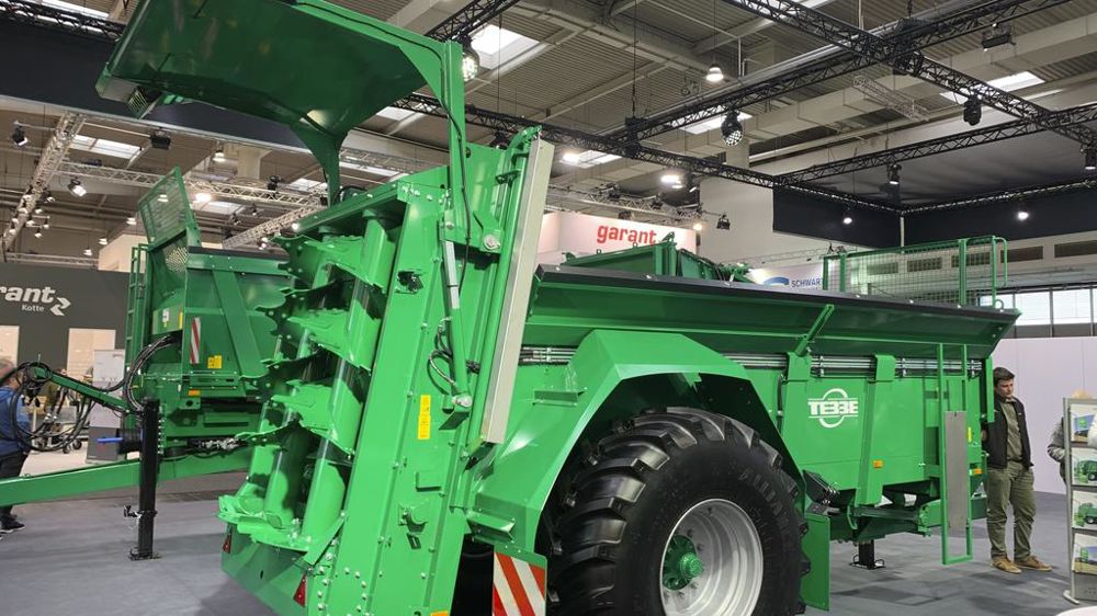 Bien connue des entrepreneurs de travaux agricoles, la marque allemande Tebbe propose également des épandeurs pour les petites et moyennes exploitations. Lors du salon Agritechnica, elle dévoilait son TS100, un modèle à caisse étroite et surbaissée à deux hérissons verticaux, dont le volume affiche 10 m3. Le fond reçoit un double tapis à chaînes marine en standard et plates en option. La force de rupture de ce fond mouvant atteint 28 t. Une porte guillotine rend le chargement étanche, tandis qu'une hotte complète l'équipement arrière. Pour obtenir un épandage plus fin du produit, par exemple du compost, cette hotte peut rester fermée afin d'utiliser uniquement la partie inférieure des hérissons dotée d'un plateau et de pales. Tebbe annonce une compatibilité Isobus en option et un contrôle en standard en cabine, via un boîtier maison.
