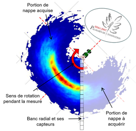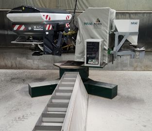 « La courbe transversale d’épandage, obtenue par la mesure des quantités collectées par des bacs positionnés perpendiculairement au sens d’avancement d’un distributeur d’engrais centrifuge, est utilisée pour caractériser la répartition de l’engrais produite par ce type de machine. Mais ceci n’est qu’une vision partielle de la répartition. Pour remédier à cela, nous avons mis au point en 2006 le banc de mesure CEMIB [diminutif de Cemagref Mineral Bench] : il nous fournit une mesure de la nappe d’épandage produite en trois dimensions. Le distributeur y est positionné sur un support rotatif au bout d’une rangée de bacs destinés à collecter et à peser les engrais distribués en continu. À l’image d’un scanner, cette partie instrumentée du banc enregistre les quantités d’engrais distribuées pour chaque angle de dépose au sol et fournit après calculs une cartographie précise des densités surfaciques distribuées. En alimentant un seul des disques de l’épandeur pour réaliser cette mesure, c’est la véritable “empreinte” laissée localement par la machine qui est ainsi enregistrée, ce qui autorise tout un panel d’usages. »