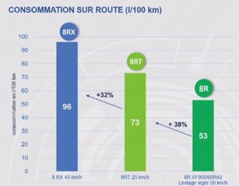 Durant ce test d’effort de traction, les équipes ont également relevé la consommation en carburant. Les écarts de consommation instantanée (L/h) entre les différentes configurations restent faibles jusqu’à 7000 daN et s’amplifie à partir de 9000 daN, toujours en faveur des modèles à chenilles. Au global, les chenilles restent conseillées en conditions extrêmes et autorisent une largeur de travail supérieure, synonyme de productivité. Augmenter la largeur de travail de l’outil attelé se révèle d’ailleurs plus judicieux que de travailler plus vite, selon John Deere. Un 8RX à quatre chenilles avec un déchaumeur de 12 m affiche une productivité (ha/h) de 63 % supérieure à celle d’un 8R à roues attelé à un déchaumeur de 8 m, et une consommation moyenne (L/ha) réduite de 13,5 %. Sur la route, en revanche, sans charge, le 8R à roues, à 50 km/h, ne consomme que 53 L/100 km, soit 38 % de moins que le chenillard 8RT, à 25 km/h. Ce dernier consomme, lui aussi, 32 % de moins que le 8RX, à quatre chenilles, qui, avec 96 L/100 km, doit emmener son poids supérieur et sa mécanique plus complexe. Sur ce point, le tracteur à roues confirme également sa supériorité en se révélant plus confortable que ses homologues à chenilles.