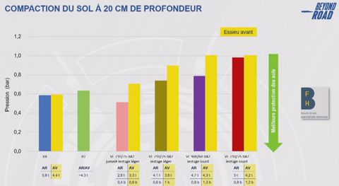 Les tests ont été accompagnés de mesures de la compaction du sol, indépendamment sur les essieux avant et arrière. A 20 cm de profondeur, le tracteur jumelé s’en sort le mieux. Avec 0,5 bar de pression mesurée sur l’arrière, il surclasse tous les autres tracteurs, y compris les modèles à chenilles 8RX et 8RT qui se positionnent respectivement deuxième et troisième sur ce critère. Le jumelage reste ainsi pertinent, en étant plus respectueux du sol qu’une monte large, même s’il se révèle plus contraignant. Seul bémol : les pneus avant gomment l’effet du jumelage arrière car ils présentent une valeur de pression significativement plus élevée que ceux arrière. Ceci démontre tout l’intérêt de jumeler les deux essieux d’un tracteur, plutôt que seul celui arrière.
