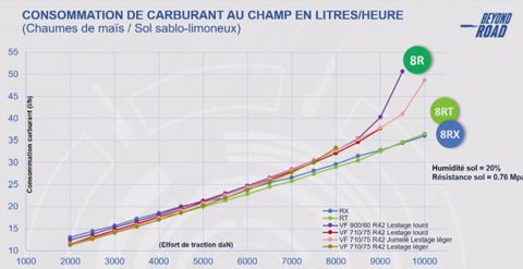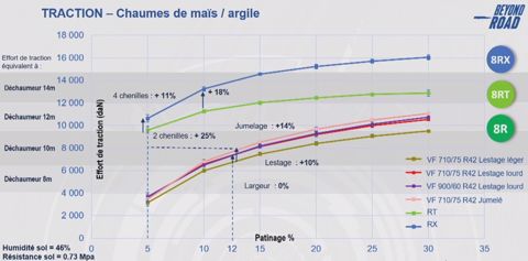Entre chenilles et pneumatiques, l’écart s’élève à 25%. L’effort de traction des meilleurs modèles à roues s’arrête là où celui des chenilles commence. Parmi les 8R dotés de pneumatiques Michelin Ultra Flex à technologie VF, le meilleur sur ce critère est celui jumelé à l’arrière en 710/75 R42, de 14 % supérieur à celui non jumelé ou à celui doté de pneu larges en 900/60 R42, l’apport de la largeur de pneumatique étant peu significatif sur ce critère.