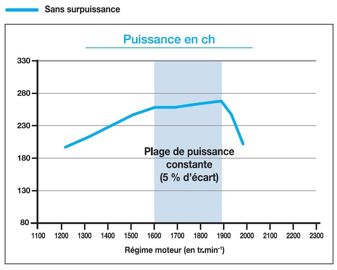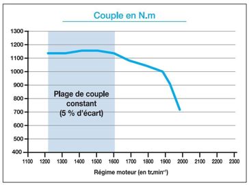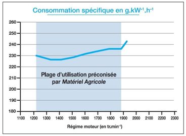 Sa puissance, son couple, sa consommation Le moteur maison à six cylindres Agco Power de 7,4 L du Valtra Q305 Direct délivre au banc de performance une puissance maximale de 267,8 ch OCDE au régime de 1 882 tr.min-1 , ce qui correspond au régime normalisé de 1 000 tr.min-1 à la prise de force. Il absorbe alors 233 g.kW-1 .h-1 de GNR. Il délivre son couple maximal de 1 155,9 N.m à 1 400 tr.min-1 .Commentaire Le Finlandais Valtra commercialise son Q305 pour une puissance maximale de 305 ch ECE R120. La différence entre la valeur mesurée au banc et celle qu'annonce le tractoriste révèle un écart de 12,2 % . Celui-ci s’explique par la différence entre les normes de mesure utilisées (voir encadré « Mémo »). Le Valtra Q305 affiche une plage de puissance, pouvant être considérée comme constante, s’échelonnant de 1 600 à 1 900 tr.min-1 . Dans cet intervalle de seulement 300 tr.min-1 , le Q305 développe plus de 254,5 ch OCDE. Sa plage de couple constant se situe entre 1 220 et 1 600 tr.min-1 , soit une plage de 380 tr.min-1 . Sa réserve de couple s’élève à 26,8 % . Sa consommation spécifique la plus faible, présentée avec la surpuissance, soit 226 g.kW-1 .h-1 , est atteinte à 1 410 tr.min-1 . Le moteur affiche alors le rendement de 35,6 % . La plage d’utilisation du Valtra Q305 Direct se situe entre 1 220 et 1 882 tr.min-1 . Ce dernier régime correspond à celui, normalisé, de la prise de force à 1 000 tr.min-1 et également à la puissance maximale fournie par le bloc Agco Power.Mémo