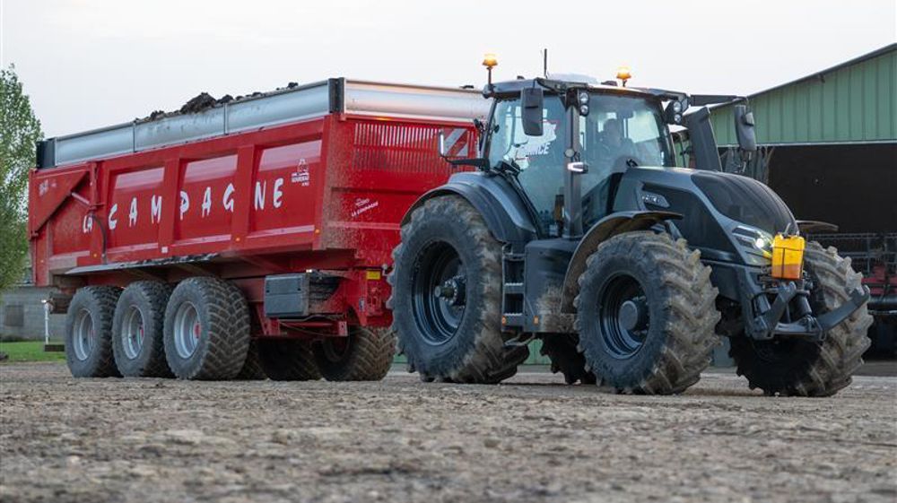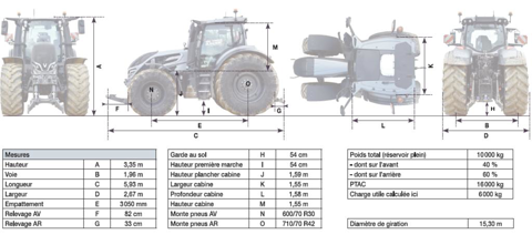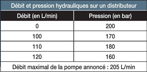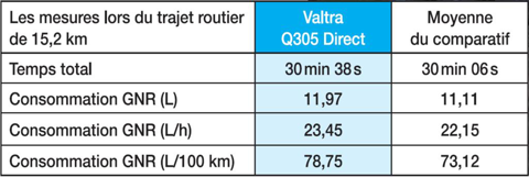 L’incidence des normes La norme ECE R120 ne prend pas en compte le rendement de la transmission, ni la puissance consommée par les pompes hydrauliques, la pompe à eau et le ventilateur, contrairement au protocole d’évaluation OCDE ici utilisé.Plages constantes Matériel Agricole estime à environ 5 % de la valeur maximale le seuil en deçà duquel la puissance et le couple peuvent être considérés comme constants.Son encombrement Le Valtra Q305 affiche un poids total de 10 000 kg avec le plein fait. Grâce à son PTAC de 16 000 kg, sa charge utile disponible présente alors une très bonne valeur de 6 000 kg. Bien que le tracteur ne soit pas lesté, il conserve de la marge pour atteler de gros outils. Son rapport masse/puissance (OCDE) atteint 37,3 kg.ch-1 . Enfin, son diamètre de giration avec les butées réglées ainsi ici ne facilite pas les manœuvres en bout de champ.Son débit hydraulique sur un distributeur Notre Q305 dispose, au choix, d’une pompe hydraulique fournissant un débit de 200 ou 205 L/min Eco . Nous avons relevé un débit maximal de 120 L/min sur un distributeur. La pression maximale du circuit atteint 200 bar au manomètre.Sa consommation sur route La route n’est pas le milieu de prédilection de notre Valtra. Tractant la benne à trois essieux La Campagne, il a réalisé un temps de parcours de 30 min 38 s , un peu au-dessus de la moyenne du groupe. Côté consommation, il est plus gourmand que la moyenne sur notre parcours.