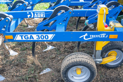 En cas d’obstacle plus important, chaque dent dispose également d’une sécurité à boulon de sectionnement. L’objectif de l’outil est de travailler à plat et à moins de 5 cm afin d’éviter le repiquage. Chaque soc à patte-d’oie mesure 30 cm de large avec un recroisement de 8 cm. Au nombre de 13 sur le modèle de 3 m observé, ils sont montés sur trois rangées. La gamme TGA existe en versions portées de 3, 4,3 et 5,6 m de largeur, ou semi-portées de 3 à 7,2 m.