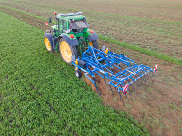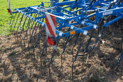 Les trois rangées de dents sont suivies de niveleurs, aussi appelés « queues d’hirondelle » pour leur forme spécifique. Ces éléments permettent de soulever les résidus végétaux et les adventices avant le passage des trois rangées de herses légères. Celles-ci pianotent pour secouer les racines en surface et écarter toute repousse.