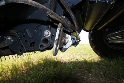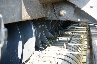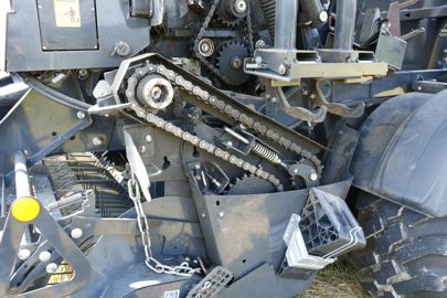 La presse Kuhn VBP 7190 embarque un pick-up à cames comptant cinq barres porte-dents. Sa largeur hors tout atteint 2,30 m, pour une largeur de ramassage DIN de 2,14 m. Ce pick-up peut suivre le relief du terrain grâce à sa fixation mobile du côté droit, autorisant un débattement vertical de +/- 5 cm. Il repose, de série, sur des roues de jauge pneumatiques ou bénéficie, en option, de pneus increvables remplis de mousse et d’une petite chambre à air. Son rouleau tasse-andain de 217 mm de diamètre s’accompagne d’un peigne actif, dont la position se règle en fonction du volume de fourrage. À 5 cm derrière le pick-up, le rotor intégral de 480 mm arbore des vis de recentrage à ses extrémités et des étoiles au centre, dont les branches sont disposées en « W », afin de répartir le flux de fourrage sur toute la largeur de la chambre. Le constructeur propose deux systèmes de coupe, à 14 ou 23 couteaux. Leur sélection s’opère manuellement, à l’aide d’une poignée disposée sur le côté. Chaque couteau profite d’une sécurité individuelle à ressort.