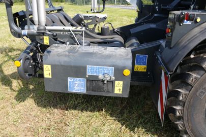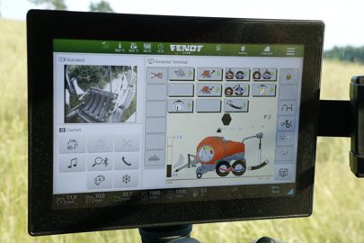 Pour fonctionner, la VBP 7190 nécessite une connexion hydraulique de type Power Beyond ou, à défaut, un distributeur à simple effet en pompage continu et un retour libre. Elle se branche au tracteur par le biais de sa prise Isobus. L’ensemble de ses fonctions se pilote alors depuis l’écran du tracteur, ou sur un écran tactile tel que le CCI 800 ou le CCI 1200. L’interface compte des icônes, chacune renvoyant vers une fonction de la presse. Il est ainsi très facile de paramétrer le diamètre des balles, leur densité, les seuils de déclenchement de la fonction iDense, qui module la densité selon le taux d’humidité, l’engagement des couteaux, le type et le nombre de tours de liage, le nombre de couches de film d’enrubannage ou encore la dépose automatique ou manuelle des balles. Pendant le pressage, un bargraphe monte au fur et à mesure du remplissage de la chambre. Des flèches indiquent au conducteur de se déporter d’un côté ou de l’autre de l’andain afin de former des balles homogènes.