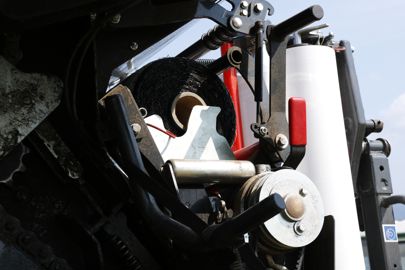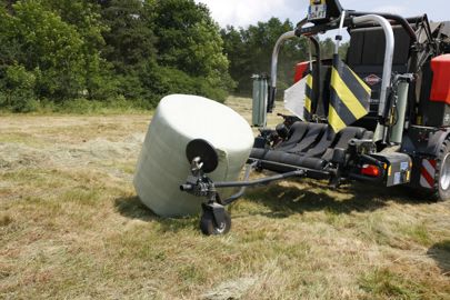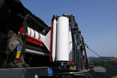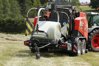 Une fois liée, la balle est éjectée de la chambre de pressage et acheminée vers la table d’enrubannage grâce à deux bras de transfert. Ces derniers reçoivent des rouleaux lorsque la presse profite du liage film, afin de ne pas déchirer l’enveloppe. Le système IntelliWrap de Kuhn permet de déposer un nombre pair ou impair de couches de film. Il adapte automatiquement la vitesse de rotation de la balle et le taux de recroisement. Avec l’enrubannage 3D, les satellites effectuent 1,5 tour autour de la balle, puis les rouleaux de film et les pré-étireurs basculent à l’horizontale avant de se placer devant et derrière la balle. Celle-ci tourne rapidement sur elle-même jusqu’à recevoir le nombre de couches de film désiré. Cette opération s’avère plus rapide qu’avec une enrubanneuse classique. Lorsque la presse est utilisée sans la fonction enrubannage, le porte-satellite se soulève de quelques centimètres, autorisant le passage de balles jusqu’à 1,85 m. La table d’enrubannage sert alors à grouper ces dernières par deux.