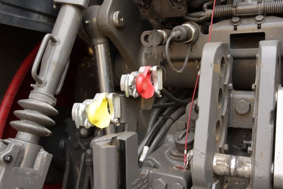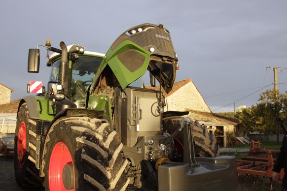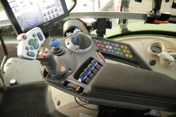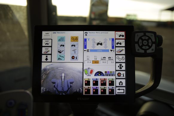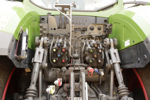 Les 900 Vario reçoivent de série un circuit hydraulique load sensing intégrant une pompe de 165 L/min. En option, ce débit grimpe à 220 L/min. Les versions Profi et Profi Plus accèdent également à une seconde pompe délivrant 210 L/min, poussant ainsi le débit total à 430 L/min. Le tracteur peut recevoir jusqu’à huit distributeurs : six à l’arrière et deux à l’avant. Ceux-ci débitent en standard 120 L/min mais peuvent laisser place à des modèles autorisant 140 L/min, voire 170 L/min, avec des raccords d’un diamètre plus important. En option, Fendt livre ses 900 Vario avec les coupleurs Power Beyond. Le volume d’huile exportable s’élève à 90 L. Chaque relevage bénéficie d’une commande électronique avec contrôle de position et d’effort. Celui qui est à l’avant peut fonctionner en simple ou double effet. Son utilisation ne condamne aucun distributeur auxiliaire, puisque les circuits travaillent indépendamment. Le relevage avant accepte une charge maximale de 5 t aux rotules. À l’arrière, cette valeur atteint 12,4 t, mais seules 9,5 t sont admissibles sur toute la course. En cabine, toutes les commandes des relevages et des distributeurs se situent à portée de main, sur l’accoudoir. L’affectation des fingertips, des boutons du joystick et du levier en croix se paramètre dans le terminal pour chacun des distributeurs.