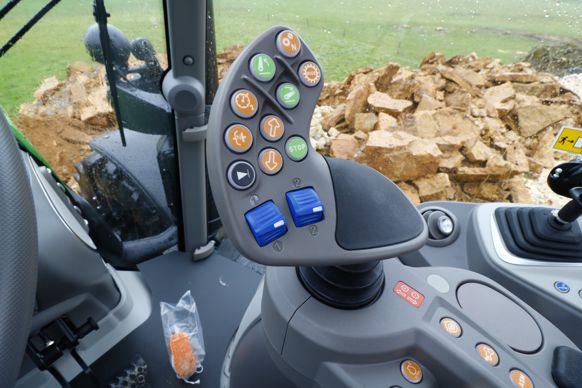 Avant de tourner la clé, prenons connaissance de l’environnement en cabine, assez simple et sans fioriture. Aucun terminal tactile à l’horizon et un agencement clair et sobre. L’accoudoir accueille principalement le joystick multifonction. Les autres commandes, à l’image des distributeurs mécaniques, de la prise de force et des molettes du relevage arrière, sont quant à elles regroupées sur la console de droite, à portée de main du chauffeur.