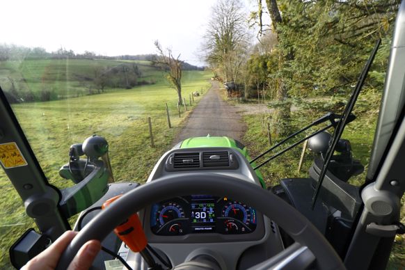 Une fois l’épandeur vide, notre agriculteur reprend la route, émaillée comme à l'aller de nombreux ralentisseurs. Le pont avant suspendu associé aux amortisseurs de la cabine rend le parcours confortable. Après deux jours de chantier, Hervé Mottiez apprécie la souplesse de l’Agrotron et la prise en main rapide, notamment grâce à l’agencement en cabine simple et sans terminal.
