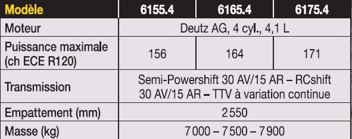 L’Agrotron 6165.4 RCshift reçoit un bloc à quatre cylindres Deutz AG de 4,1 L turbocompressé développant 164 ch (ECE R120) de puissance maximale et 171 ch avec surpuissance. Pour répondre à la dernière norme antiémission Stage V, il s’équipe d’une vanne EGR, d’un catalyseur SCR et d’un filtre à particules passif. La régénération de ce dernier s’opère chez le concessionnaire lors de l’entretien, dont l’intervalle est de 500 heures. L’ouverture du capot monobloc donne accès aux organes du moteur, dont le filtre à air prend place à hauteur d’homme, devant le bloc de refroidissement. Ce dernier se compose d’une succession de cinq radiateurs : moteur, huile de transmission, intercooler, climatisation et, tout à l’avant, le radiateur de refroidissement du GNR. Le constructeur facilite l’accès à ce bloc par une ouverture en portefeuille des radiateurs, assistée par des vérins à gaz. Le filtre à carburant, le bouchon de remplissage de l’huile moteur et sa jauge intégrée se tiennent sur le flanc gauche du moteur. Les filtres à huile, dont l’accès nécessite le démontage d'un panneau latéral à l’aide d’une clé de 13, se situent de l’autre côté. Le réservoir de carburant affiche une contenance de 225 L contre 28 L pour celui d’AdBlue.