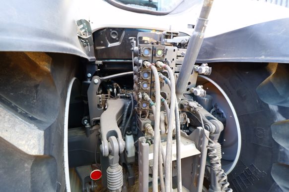 Sur les tracteurs de la série T, les huiles de la transmission et de l’hydraulique sont séparées. Valtra propose, au choix à la commande, trois débits hydrauliques : 115, 160 et 200 L/min. Notre T214 accède à ce dernier circuit à signal de charge. Celui-ci alimente jusqu’à cinq distributeurs à double effet à l’arrière (quatre de série) et quatre ventraux (deux de série). Un sixième distributeur arrière, doté d’un débit de 10 L/min, sera dédié, par exemple, à l’utilisation d’un troisième point hydraulique. Pour lever les plus grosses bennes, 47 L d’huile issue du tracteur sont exportables. Le relevage arrière, de catégorie III, présente une capacité maximale de 9,5 t. Il s’équipe de deux chandelles et de deux stabilisateurs réglables. Le relevage avant, proposé en option, soulève jusqu’à 3,5 t.