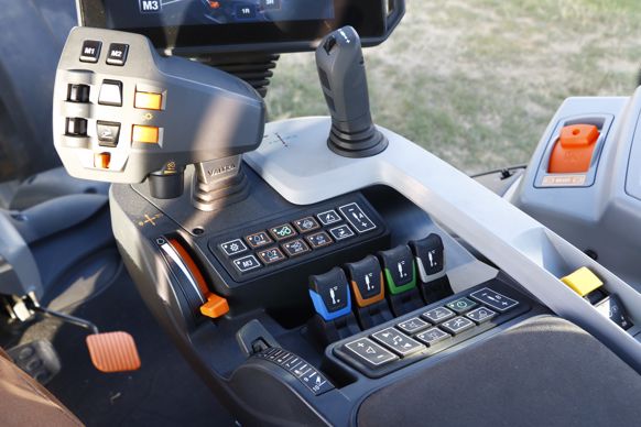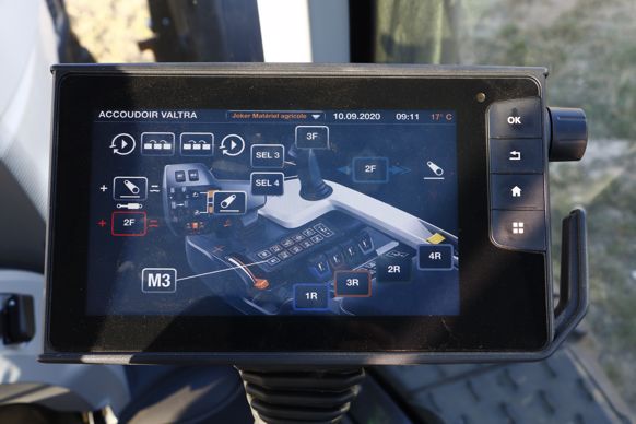 4- L’accoudoir regroupe l’intégralité des commandes du tracteur, soit un joystick multifonction, un levier en croix, des fingertips, différents boutons et molettes ainsi que le terminal à son extrémité.