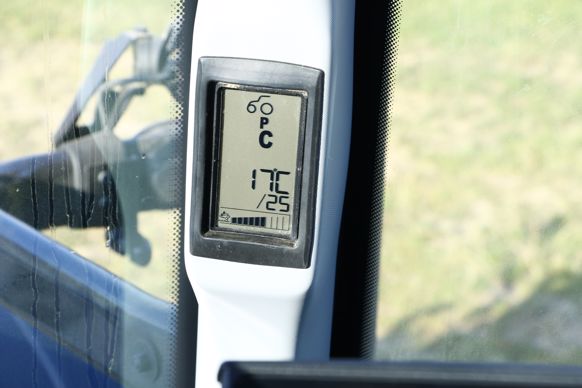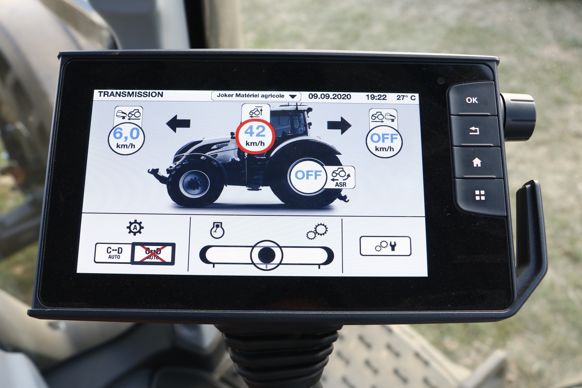 Le Valtra T214, tout comme les autres tracteurs de la gamme, bénéficie de la transmission à variation continue maison Direct. Celle-ci fonctionne selon quatre gammes mécaniques, A, B, C et D, issues de la transmission robotisée Versu à laquelle le constructeur ajoute un module hydrostatique. En cabine, l’opérateur gère l’avancement à la pédale de droite ou à l’aide du joystick. Deux boutons sur ce dernier permettent de sélectionner la plage correspondant aux gammes de la transmission : de 0 à 9 km/h pour la gamme A, de 0 à 16 km/h pour la B, de 0 à 28 km/h pour la C et de 0 à 53 km/h pour la D. La Direct offre deux pics par plage durant lesquels elle travaille en 100 % mécanique : à 2 et 6 km/h dans la plage A, à 4 et 11 km/h dans la B, à 7 et 20 km/h dans la C et à 13 et 37 km/h dans la D. Le chauffeur peut mémoriser une vitesse cible par plage et l’activer en basculant le joystick sur la droite. Il accède au paramétrage de la tolérance de chute de régime via le terminal. Ce dernier offre cinq niveaux de chute plus ou moins importants.