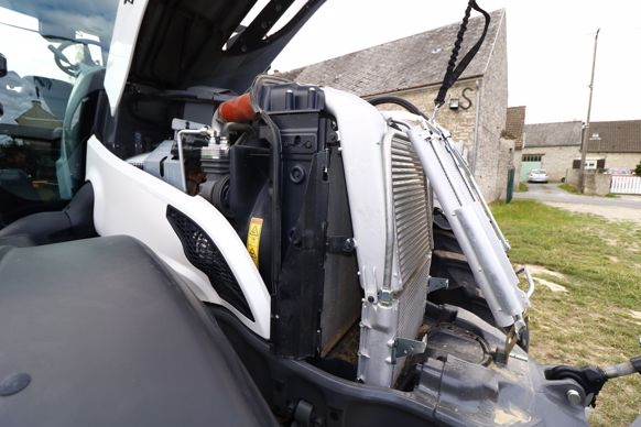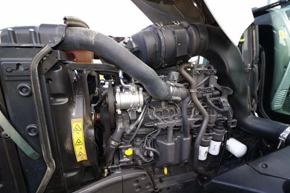 Le six-cylindres maison Agco Power de 7,4 L motorise les cinq plus gros modèles de la gamme de tracteurs Valtra série T. Pour répondre à la norme antiémission Stage V en vigueur, il s’équipe d’un dispositif de réduction catalytique sélective (SCR), avec l’injection d’AdBlue, d’un catalyseur d’oxydation diesel (DOC) et d’un filtre à particules passif (FAP). Le moteur du T214 développe une puissance maximale de 215 ch ISO TR14396, voire de 230 ch lors de l’activation de la surpuissance. Le bloc de refroidissement se compose de différents radiateurs. Celui qui se destine à la climatisation pivote en avant, tandis qu’un espacement de plusieurs centimètres est prévu entre les autres afin de faciliter leur entretien. Le réservoir de carburant peut contenir 380 L, et celui d’AdBlue 70 L. Seule l’ouverture du capot monobloc est nécessaire pour accéder aux organes d’entretien du moteur, sans démontage des deux parties latérales.