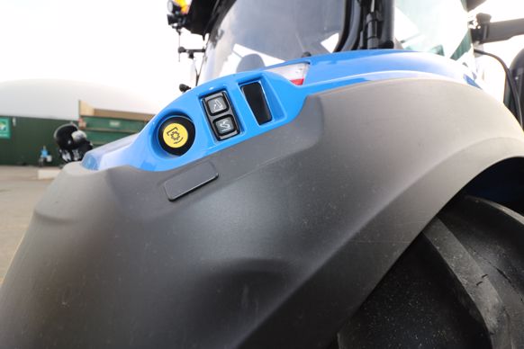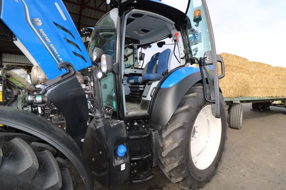 La numérotation sur le capot des T5 correspond à la puissance maximale du tracteur, allant de 110 à 140 ch dans cette gamme. Ces tracteurs, équipés d’un moteur maison FPT à quatre cylindres turbocompressé de 4,5 L, ne disposent pas de surpuissance. Celui-ci répond à la norme en vigueur Stage V grâce à un catalyseur d’oxydation diesel (DOC) et à l’association de deux solutions de réduction catalytique sélective nommées « SCROF » et « SCR/CUC ». Ces derniers accompagnent le tracteur durant toute sa vie sans nécessiter de régénération. Ce système SCR à double filtration prend place au pied du pot d’échappement afin de pénaliser au minimum la visibilité pour le chauffeur. Malgré la présence de deux panneaux latéraux, l’ouverture du capot monobloc donne un accès rapide au bloc de refroidissement et au filtre à air. Les radiateurs disposent d’une charnière, d’une glissière et d’une trappe latérale afin de faciliter leur accessibilité pour leur nettoyage à l’air comprimé. Les interventions à intervalles de 500 heures, notamment sur les filtres à GNR, côté gauche, et sur celui de l’huile, à droite, requièrent le démontage rapide des carénages inférieurs latéraux. La jauge à huile se tient sur le flanc gauche du moteur et permet le remplissage du lubrifiant après la vidange. Le réservoir de GNR contient 180 L, et celui d’AdBlue 19 L.