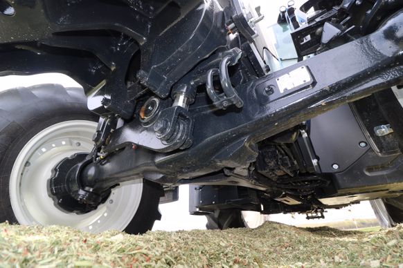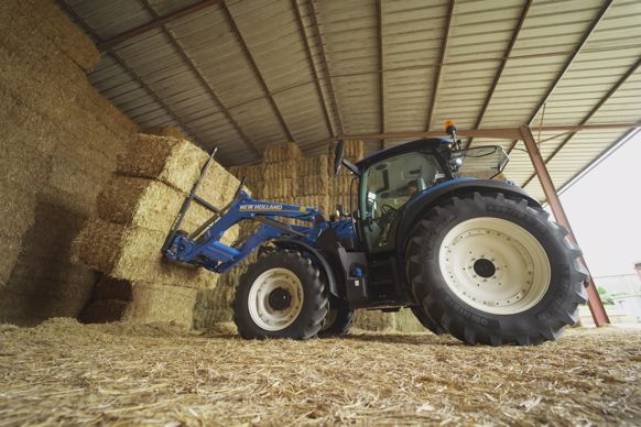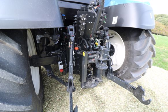 Le New Holland T5.120 dispose d’un circuit hydraulique à signal de charge dont le débit atteint 110 L/min. La pompe à plateau alimente, sur notre modèle essayé, cinq distributeurs à double effet, dont deux à commande électrique depuis le levier en croix. Ces derniers, installés en montage central, alimentent le chargeur frontal. Les trois leviers mécaniques pilotent les distributeurs arrière. Le relevage arrière, de catégorie III, doté d’une gestion électronique, affiche une capacité de 5,5 t. Il dispose de deux chandelles réglables et de deux stabilisateurs à secteurs à trous. Les montées et descentes se contrôlent depuis le joystick. Pour l’attelage des outils, notre tracteur s’équipe d’une échelle supportant un crochet en chape et, en bas, d'un attelage de type piton pouvant accueillir, en partie basse, une barre oscillante. Deux supports de rangement accueillent les rotules lorsque ces dernières ne sont pas utilisées. En option, New Holland propose un troisième point hydraulique.