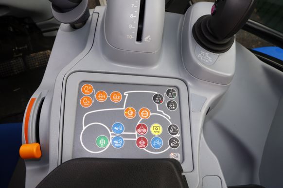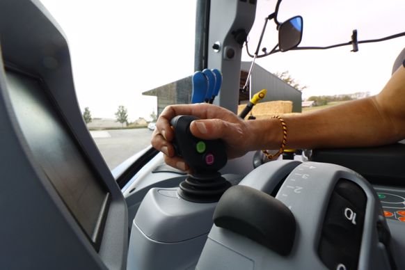 La série T5 se décline en deux versions de transmission : variation continue Auto Command et semi-powershift Dynamic Command. Cette dernière, jusque-là proposée uniquement sur la gamme de tracteurs T6 (voir notre essai du T6.165 DC dans Matériel Agricole no 253, daté avril 2019), équipe les T5 depuis le salon Agritechnica 2019. Elle repose sur la technologie à double embrayage offrant un passage robotisé des trois gammes A, B et C sans rupture de couple. Les huit powershifts portent le nombre de vitesses à 24 en marches avant et arrière. La Dynamic Command offre un recroisement important des gammes favorisant l’étagement des vitesses : de 0 à 9 km/h pour la gamme A, de 4 à 17 km/h pour la B, et de 9 à 40 km/h pour la C. En cabine, la transmission se gère au joystick qui reste néanmoins fixe pour cette gamme de tracteurs d’élevage. Le passage des gammes et vitesses se contrôle à l’aide du pouce par des boutons au code couleur orange. Les différents réglages avancés de la transmission, à l’instar du Start&Stop, s'effectuent depuis le petit écran au tableau de bord. Ils demandent un certain temps d’adaptation. L’inversion du sens de marche se gère au joystick ou au volant. La prise de force bénéficie en série de trois régimes.