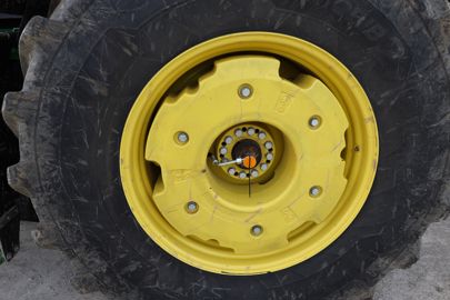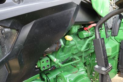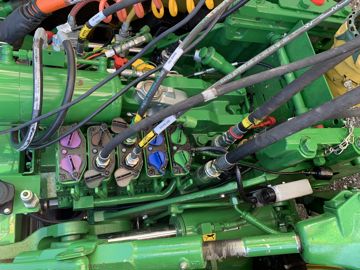 Comme d’habitude chez John Deere, la dénomination sur le capot moteur des 8R correspond à la puissance au régime nominal, soit 410 ch pour notre modèle essayé. Ce 8R 410 développe 443 ch ECE R120 de puissance maximale. Grâce à la surpuissance intelligente IPM lors des travaux mobiles à la prise de force ou au transport au-delà de 15 km/h, le 8R 410 développe alors 458 ch. Celle-ci est fournie par un bloc maison John Deere PowerTech PSS à six cylindres de 9 L de cylindrée. Ce moteur bénéficie de deux turbocompresseurs, l'un fixe et l'autre à géométrie variable. Il répond à la norme antipollution Stage V grâce à un catalyseur d’oxydation diesel (DOC), à un filtre à particules (FAP) et à une réduction catalytique sélective (SCR) avec de l’AdBlue. Le carburant est contenu dans un impressionnant réservoir de 727 L, contre 37,2 L pour l’urée. Comme tout tracteur américain qui se respecte, le bloc de refroidissement prend place au-delà du pont avant, regroupant les radiateurs utiles au moteur, à l’intercooler, à la climatisation et aux circuits hydrauliques. Le ventilateur viscostatique à commande électronique fait appel à une unique courroie, entraînant également l’alternateur et le compresseur de climatisation.