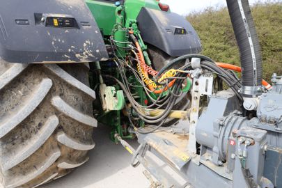 Les 8R 370, 8R 410, 8RT 370 et 8RT 410, 8RX 370 et 8RX 410, les six modèles les plus puissants de la gamme dotés respectivement de roues, de deux et quatre chenilles, sont à ce jour les seuls tracteurs de la marque au cerf à disposer de la transmission eAutoPowr. Jusque-là, le 8R 410 s’équipait uniquement de la full-powershift e23. Cette transmission à variation continue EVT se démarque de l'IVT (AutoPowr) par l’absence de module hydrostatique, remplacé par un circuit d’alimentation électrique. La partie mécanique passe à cinq vitesses, contre quatre pour l'IVT, dotées d’embrayages multidisques. La génératrice fournit du courant sous une tension de 480 V en triphasé et alimente un moteur électrique utile à la transmission. Cette solution simplifie, selon la marque, sa conception et permet des diagnostics techniques à distance. De 0 à 5 km/h, la transmission fonctionne à 100 % en électrique. Au-delà, un jeu de trains épicycloïdaux et cinq embrayages multidisques assurent la variabilité de la vitesse jusqu’à 50 km/h. En cabine, rien ne différencie l'AutoPowr de l’eAutoPowr. Le tracteur dispose des mêmes stratégies de conduite avec le joystick CommandPro ou sans (CommandArm). Le module électrique abaisse les nuisances sonores en cabine de 23 %, d'après le constructeur. L’électrification a également permis à John Deere de développer, en partenariat avec Joskin et les optionnels ponts moteurs E-drive, une connexion électrique à l'arrière du tracteur via une prise normalisée. Ce nouvel équipement fournit une puissance de 100 kW aux deux ponts moteurs de la tonne à lisier du fabricant belge. Cette puissance s’active de manière automatique et jusqu’à 14 km/h en cas de patinage du tracteur. Dans la cabine du tracteur, le « TAM » (Traction Assist Management) offre trois niveaux d’agressivité – 1, 2 et 3 – correspondant respectivement à des taux de patinage du tracteur de 10, 7 et 4 %.