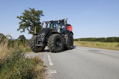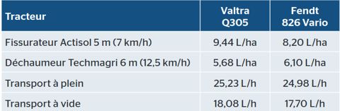 Une fois les travaux dans la parcelle terminés, nous testons le tracteur au transport. Pour cela, nous regonflons ses pneumatiques puis attelons une benne Thievin à deux essieux de 21 t que nous chargeons de fumier. Nous nous élançons pour un parcours de 4 km jusqu’à la parcelle dans laquelle nous devons décharger. Sur la route, le Q305 s’avère stable et distille un sentiment de sécurité. Là encore, le confort est au rendez-vous. La prise d’air à gauche et le pot d’échappement à droite, profilés et disposés dans l’alignement des montants du pare-brise, n’obstruent pas le champ de vision. Les rétroviseurs, dont les supports télescopiques se commandent depuis le siège, permettent de toujours garder un œil sur les roues de la remorque. Dans les descentes, il suffit de tirer sur le joystick pour faire monter le moteur dans les tours et obtenir un plus grand effort de ralentissement. Le Valtra retient bien la charge puis, lorsque la montée suivante se présente, profite de son élan pour hisser le convoi sans perdre trop de vitesse. Cette fois encore, nous avons réalisé le même trajet à plein et à vide avec le Fendt 826 Vario afin de mesurer les consommations des deux tracteurs.