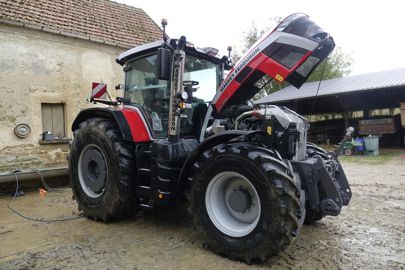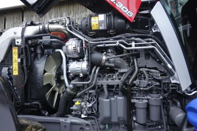 Notre tracteur d’essai, le 8S.305, développe une puissance maximale de 305 ch et un couple de 1 280 Nm à un régime moteur compris entre 1 000 et 1 500 tr/min. Ce bloc est dépourvu de vanne EGR. Il répond à la norme antipollution Stage V grâce au dispositif de dépollution All-in-One composé d’un catalyseur de suie DOC et d'un système SCR avec injection d’AdBlue. Ces derniers, couplés à l’échappement, sont directement intégrés sous la cabine, du côté droit, afin d’optimiser l’espace pour conserver un châssis en taille de guêpe et préserver la visibilité depuis l’habitacle.