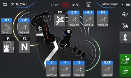 6 - Le levier en croix multifonction électrohydraulique pilote les distributeurs hydrauliques qui lui sont affectés.