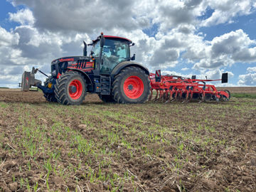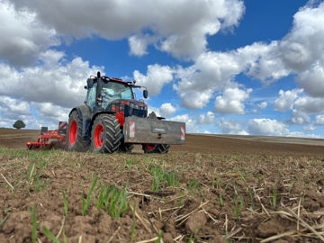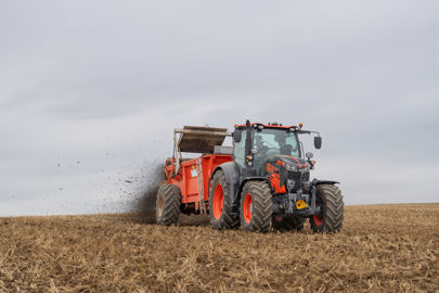 Bon, vu la taille de l’épandeur, à peine ai-je fait un passage que je dois déjà retourner au tas pour recharger. Le chemin quelque peu cahoteux me donne l’occasion d’apprécier la suspension pneumatique de la cabine, combinée à l’amortissement hydropneumatique du pont avant. Les amuse-bouche étant avalés, place au plat de résistance : le déchaumage. Kubota a mis à notre disposition, en plus du tracteur, un déchaumeur porté à trois rangées de dents de 4 m d’envergure. L’outil aux couleurs de la marque est si lourd que la masse avant de 750 kg ne suffit pas à équilibrer le tracteur. Nous optons donc pour une masse de 1 t. Une fois l’outil réglé et le guidage paramétré, le Kubota peut montrer son potentiel. Bien qu’il ne parvienne pas toujours à atteindre la vitesse demandée de 8 km/h, il ne se laisse pas mourir pour autant.