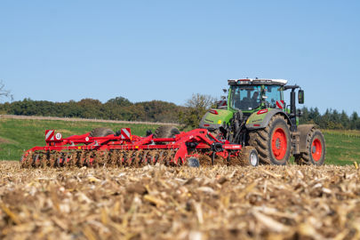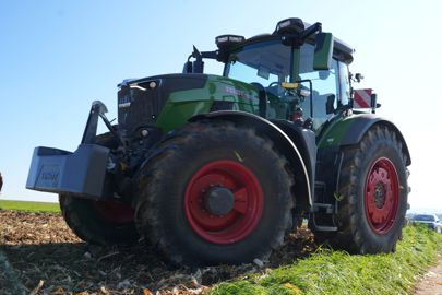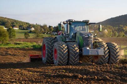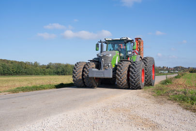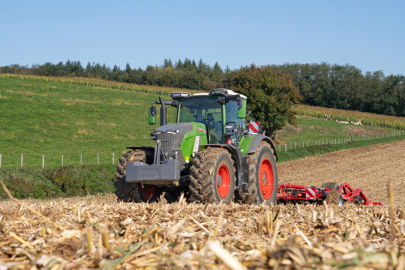 Les aficionados de la marque allemande se sont sûrement posé la question : quels modèles peut bien proposer Fendt entre son 728 Vario Gen 7 et son 930 Vario Gen 7 ? Eh bien, voilà ! À mi-chemin entre les deux gammes, les 800 Vario Gen 5 possèdent tout simplement l’avant des 700 Vario Gen 7 et la cabine des 900 Vario Gen 7. La série 800 Vario, dotée d’un moteur Agco Power de 8 L de cylindrée, vient ainsi compléter le catalogue. Les 826, 829 et 832 Vario développent respectivement 260, 290 et 320 ch de puissance maximale. Romain Lucas, chef de produit tracteur chez Fendt France, nous a proposé à l’essai un 829 avec, cerise sur le gâteau, un jumelage intégral fourni par Ermas et Trelleborg. L’essai étant programmé sur la ferme familiale, dans la Haute-Saône, je me dis que cet équipement sera parfait pour greffer le tracteur à des chantiers de travail du sol en vue des semis de blé. Nous avons ainsi sollicité Horsch, Grégoire Besson et Maschio Gaspardo pour la mise à disposition de matériels, ou encore Thievin pour une remorque. Le montage du jumelage réalisé par nos soins fera d’ailleurs l'objet d'un sujet à part entière dans un prochain numéro. La première journée commence plutôt en douceur avec deux parcelles à déchaumer derrière un maïs grain fraîchement récolté, et ce, à l’aide d’un outil à disques Grégoire Besson Occitan T60 de 5,2 m. Je connecte les flexibles ainsi que le freinage simple ligne hydraulique. J’effectue ensuite mes attributions via le terminal en cabine afin de disposer de l’essieu et du terrage sur les distributeurs du joystick du tracteur, tombant, soit dit au passage, parfaitement sous le pouce. Me voilà parti !