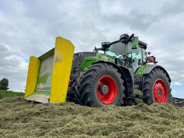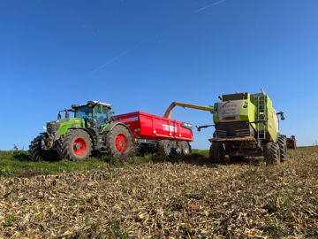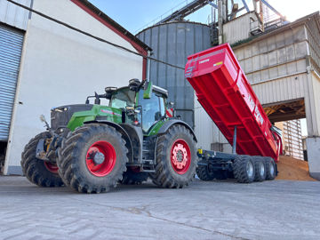 Le jumelage étant démonté, je dételle également la masse frontale. J’attelle ensuite la benne Thievin Cortal de 24 t derrière le Fendt. Je branche la prise de force, les flexibles et le freinage pneumatique. Le premier chantier routier consiste en la livraison de bennes de soja lors des moissons. Le Fendt ne peine pas à traîner les 20 t de graines qu'elles contiennent. Avec sa transmission VarioDrive basée sur celle des 900 Gen 7, aucun changement de gamme n'est nécessaire entre le champ et la route. Bien que la caisse de la Thievin mesure 8,5 m de long, le 829 me permet tout de même de manœuvrer aisément dans le silo plutôt exigu.