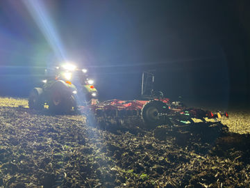 En cette mi-octobre où les jours raccourcissent de plus en plus, j’effectue toutes mes fins de journée de nuit. J’apprécie alors l’élément dont tout le monde parle au sujet de ces tracteurs Fendt 800 Vario : l’éclairage. J’allume l’intégralité des feux du tracteur et de la casquette de toit retravaillée, et règle l’intensité d’éclairage sur 5. Rien que le toit du Fendt accueille à lui seul 12 phares de travail ! Lorsqu'il s’approche au pied du tracteur, mon collègue se cache les yeux face à l’intensité lumineuse. Je reste bluffé par la vue lointaine que procurent ces feux. Pour l’anecdote, je vois beaucoup plus de gibier que d’habitude traverser la parcelle ! Le déchaumage terminé, je profite de la nuit, mais surtout du confort que m’apportent les feux de travail, pour atteler… D’ailleurs, un autre éclairage au bas des ailes se veut utile et sécurisant pour accrocher les outils dans la pénombre. Un chantier se prolonge dans la nuit : la préparation d’un lit de semence avec une herse rotative Maschio Gaspardo Aquila 6000 Rapido. Une fois au champ avec la machine de 6 m de large, le tracteur évolue à 5 km/h au régime moteur d’environ 1 450 tr/min pour 1 000 tr/min à la prise de force, alors programmée en « 1 000 Eco ». Mon chantier avec la herse rotative se poursuit alors de nuit, mais je vois comme en plein jour. Le lendemain, nous démontons le jumelage afin d’apprécier les capacités de roulage de ce bébé au transport. Programme de la fin de semaine : moisson du soja et du maïs.