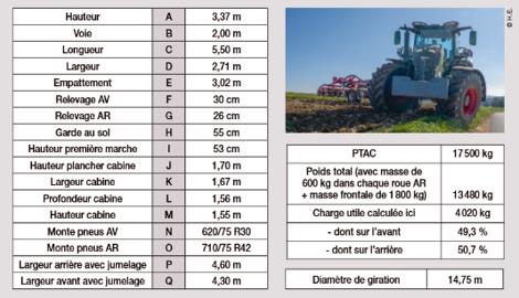 Le Fendt 829 Vario , dans la configuration de l’essai, affiche un poids total de 13 480 kg , avec les deux réservoirs sur la réserve. Il reçoit une masse frontale de 1 800 kg et une masse de 600 kg dans chaque roue arrière . Sans ce lestage, le Fendt affiche donc un poids de 10 480 kg . Son rapport masse/puissance (OCDE) atteint alors 36,1 kg.ch.-1 . Grâce à son PTAC de 17 500 kg à la vitesse de 40-50 km/h , sa charge utile disponible sans lestage présente une très bonne valeur de 7 020 kg . Dans le cadre de notre essai, avec ses 3 000 kg de masses , le 829 Vario dispose d’une charge utile de 4 020 kg . Ainsi, même avec un lestage important, il conserve de la marge pour atteler des outils portés lourds, à l’image de la herse rotative Maschio Gaspardo de notre essai pesant 3,6 t.