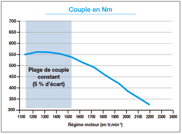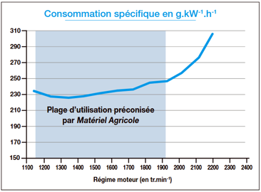 Case IH annonce une puissance maximale de 130 ch ECE R120. Notre Vestrum 120 a développé un maximum de 122,9 ch. L’écart entre les valeurs mesurées et celles qu’annonce le constructeur s’établit à environ 5,5 %. Il s’explique principalement par la différence entre les normes de mesure utilisées (voir encadré « L’incidence des normes »). Le régime de puissance maximale, de 1 730 tr.min-1 , s’avère proche de celui correspondant aux 1 000 tr.min-1 de la prise de force. À 1 730 tr.min-1 , la prise de force tourne au régime de 900 tr.min-1 . Ceci confère au tracteur une réserve de puissance lors des travaux à la prise de force. Sa plage de puissance constante s’étend de 1 540 à 1 930 tr.min-1 . Du côté du couple, la valeur maximale de 562,2 N.m est atteinte à 1 250 tr.min-1 . La plage de couple constant, pour sa part, se situe entre 1 150 et 1 550 tr.min-1 . Lors des applications de transport, le conducteur aura tout intérêt à exploiter le début de cette plage, dans la zone de plus faible consommation de gazole. Ainsi, ce tracteur offre une plage optimale d’utilisation comprise entre 1 150 et 1 930 tr.min-1 .